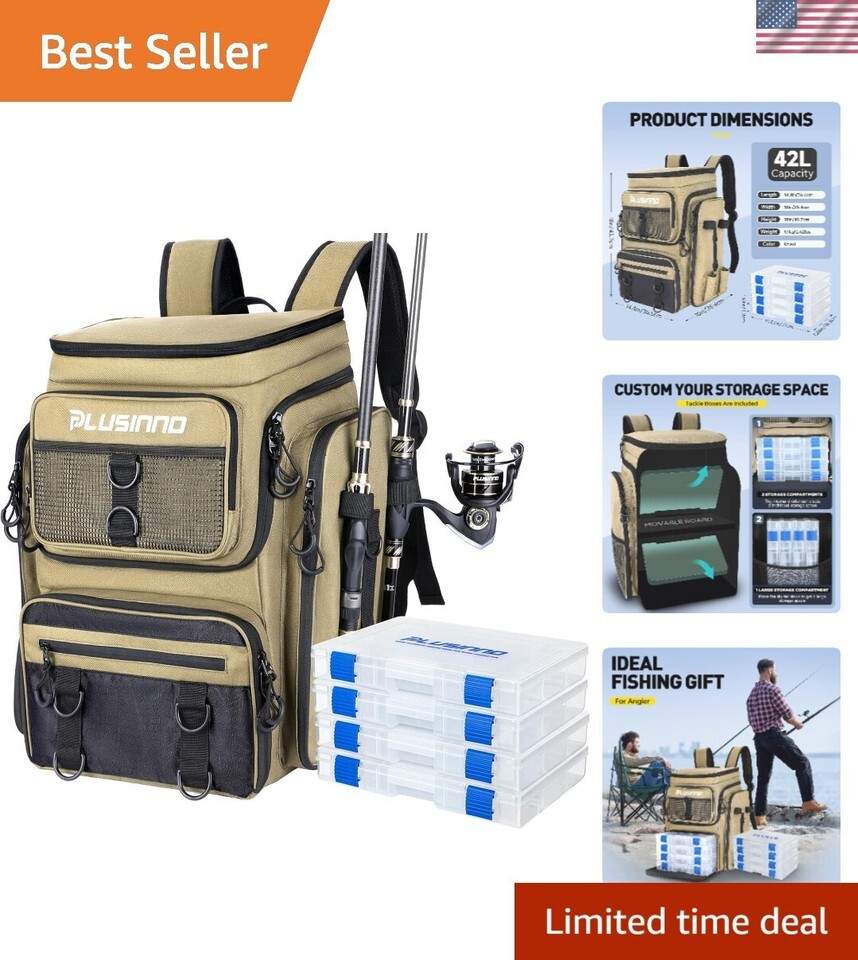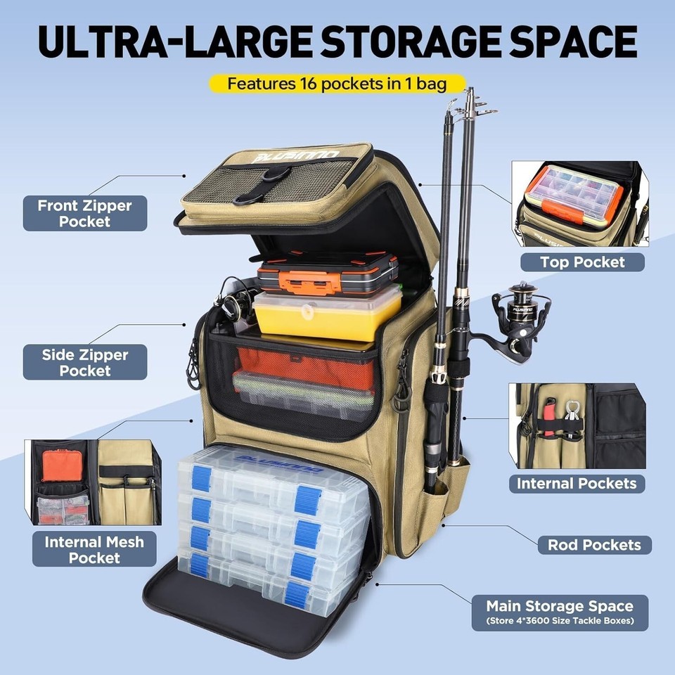 LARGE BACKPACK WITH 16 STORAGE POCKETS - fishing backpack has a 42L large-capacity storage space for all your essentials for a day of fishing. Dimensions: ?x10?x18?. This whole fishing tackle backpack contains 16 independent pockets and storage areas that provide enough space to organize all your fishing gear and accessories, like fishing rods, reels, pliers, tackle boxes, fishing tools, controller, water bottle, etc