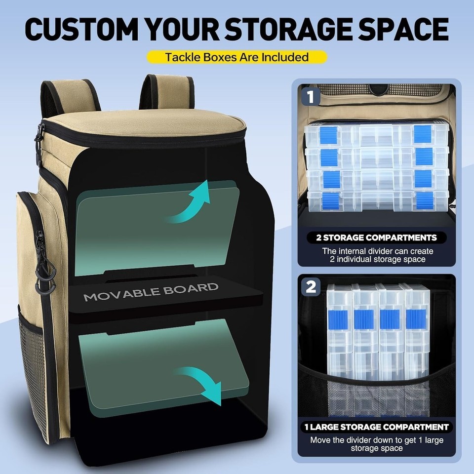 fishing backpack with rod holders offers a customizable main compartment. Its adjustable partition allows you to create one large storage space or two individual storage spaces. Measuring 12'' X '' X 16'', it can accommodate large-size tackle boxes. Additionally, the backpack comes with four fishing tackle boxes, providing convenient and organized storage for your fishing essentials