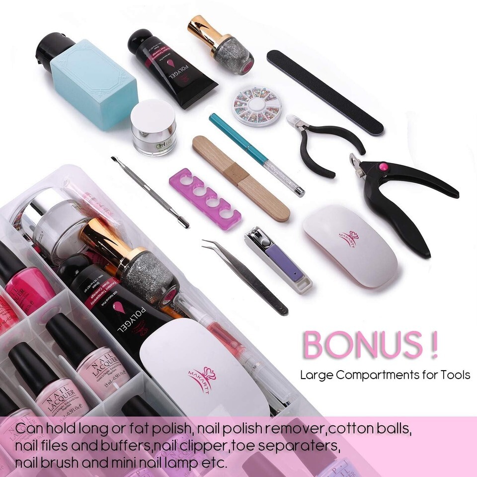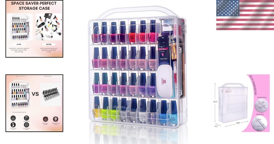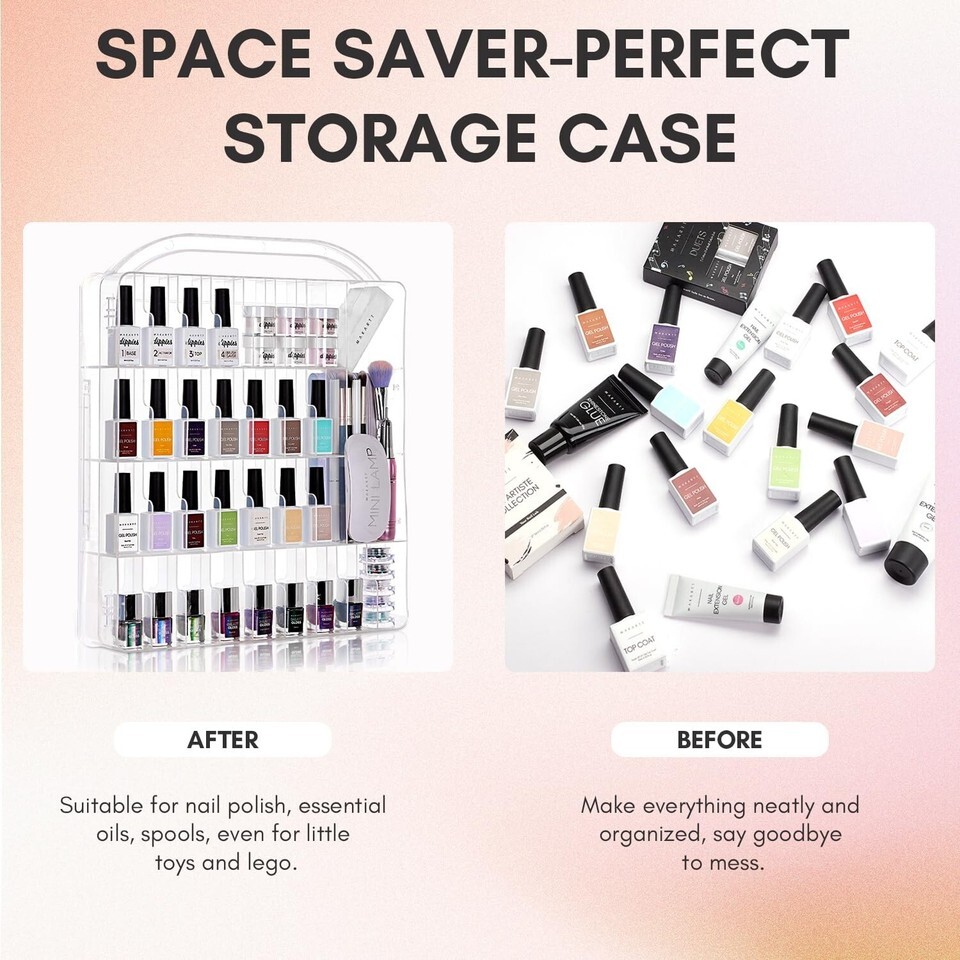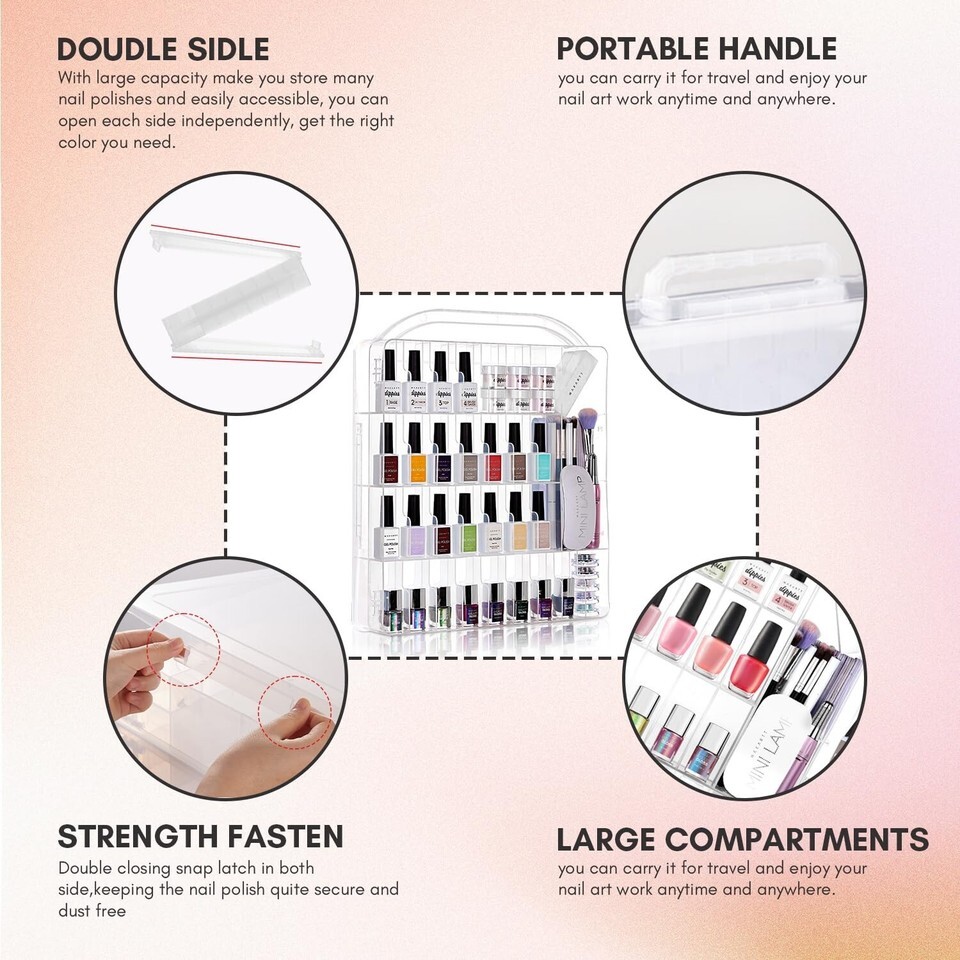 Elevate your nail care experience with our Compact Nail Polish Storage Case, designed for the modern woman on-the-go. Made from , durable materials, this case securely houses up to 60 bottles of your favorite nail polish, along with an extra-large compartment for larger accessories like poly extension gels and mini nail lamps. Say goodbye to clutter and frustration; now you can easily see and select your desired colors, making the nail decorating process a pleasure.