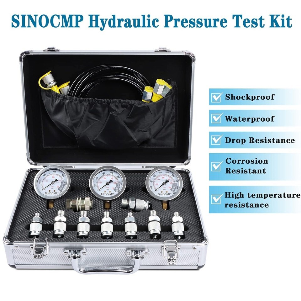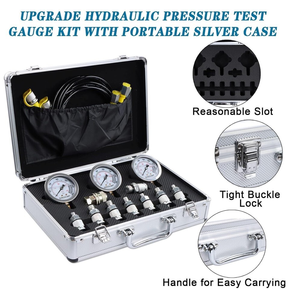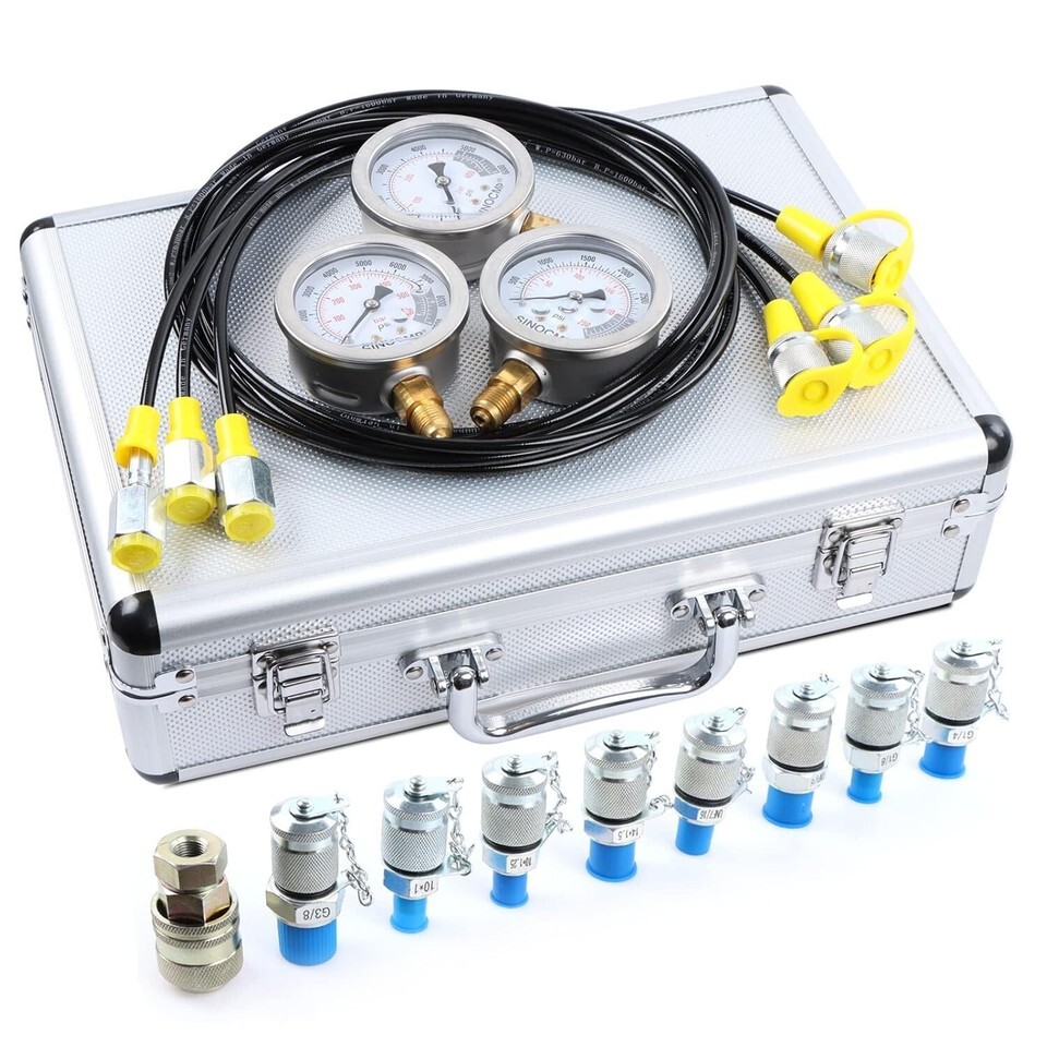 ?All-in-One Convenience design?3x Test Hoses, 9x Test Couplings, 3x Hydraulic Test Guages, 1x Aluminum Portable Storage Case. All the parts of the kit are placed in the box with a compact packaging design saves storage space and is easy to carry.