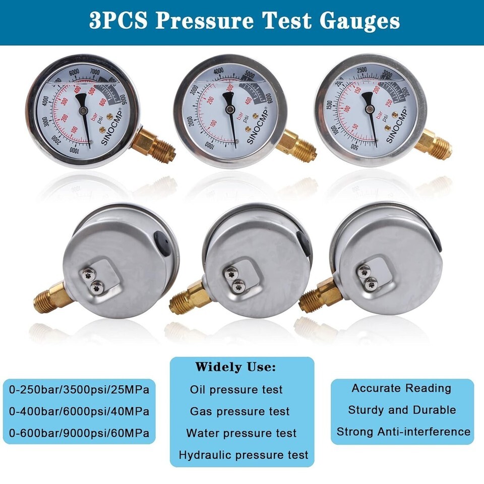 ?Stable Pressure Measurement?Hydraulic gauge kit has 3 gauges with a diameter of 63 mm with different ranges of measurement:0-250 Bar/0-4000 PSI, 0-400 Bar/0-6000 PSI, 0-600 Bar/0-10000PSI. The display has scale parameters in two units can accurately measure pressure. The instrument filled working silicone oil to effectively avoid vibration and pulsation, providing stability for long-term use and measurement.