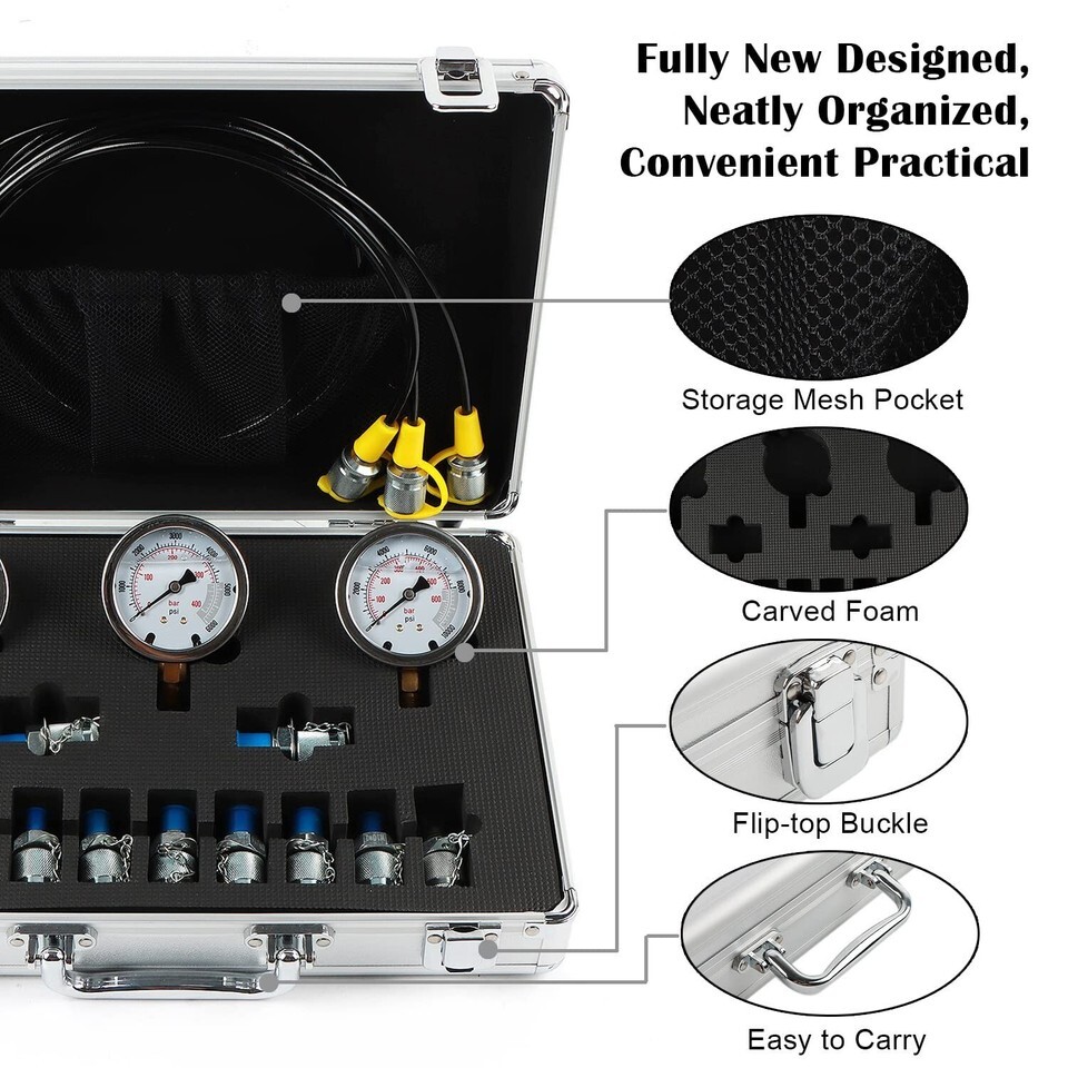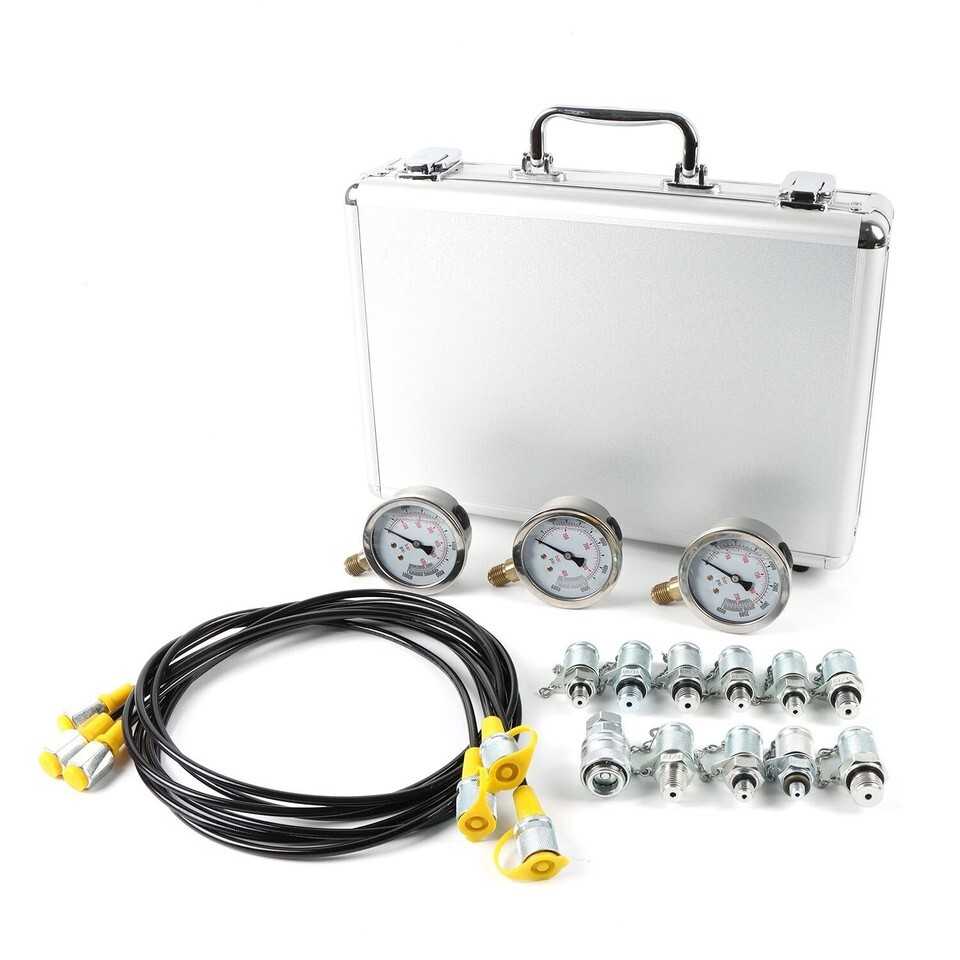 Hydraulic Pressure Test Kit 25/40/60Mpa, 3 Gauges 11 Couplings 3 Test Hoses, ...