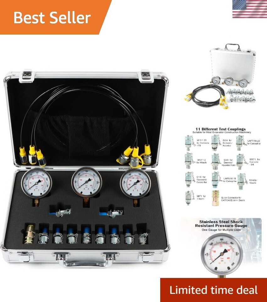 Hydraulic Pressure Test Kit 25/40/60Mpa, 3 Gauges 11 Couplings 3 Test Hoses, Hydraulic Pressure Gauge Kit for Excavator Tractors Construction Machinery