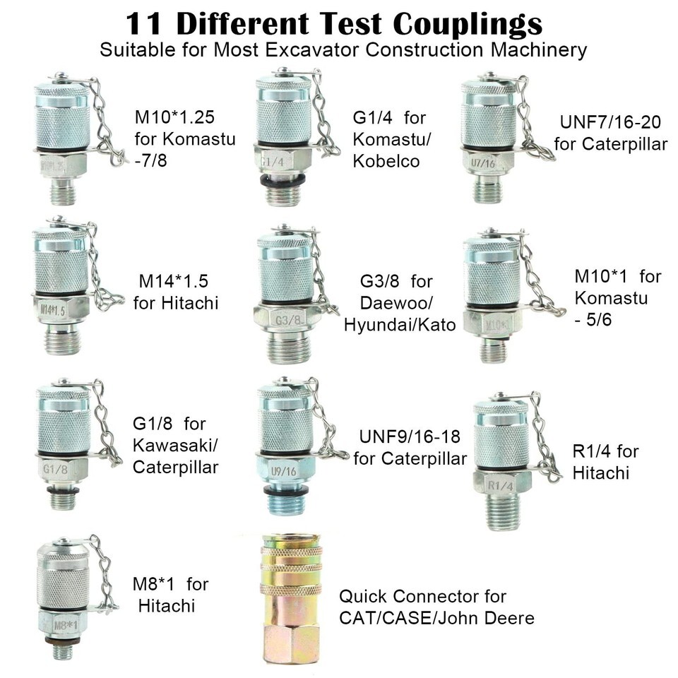 ?Test Coupling: 11 interchangeable test couplings, with the sizes of R1/4, G1/4, G1/8, G3/8, M8*1, M10*1, M10*, M14*, UNF7/16-20, UNF9/16-18, quick connector, which are suitable for many kinds of standard excavator(CAT/CASE/John Deere/Komastu)