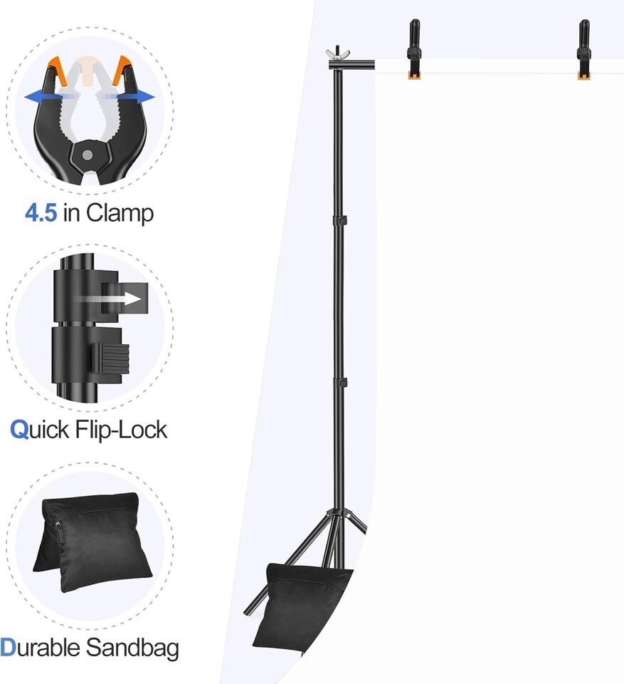 ?Multifunctional Application?This backdrop stand kit is suitable for newborn photography, baby photo shoot, professional photo studio shooting, product display background, DIY photo booth, pet pictures, shooting video or home/wedding/parties decoration. Note: Due to gravity, the crossbar will bend slightly, It is not suggest to hang anything too heavy and kindly please use sandbags to add weight for keeping stable in windy conditions.