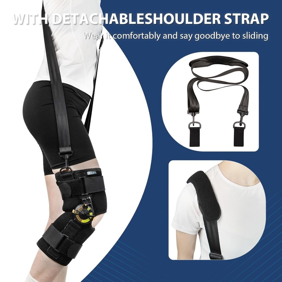 Detachable Adjustable Shoulder Strap: Effectively prevent knee brace from sliding. This ROM brace is fully adjustable and easy to wear. You are free to disassemble the hinges and fastening straps and move hinged anywhere you need. And adjust the strap, so as to effectively fix the support and prevent sliding.