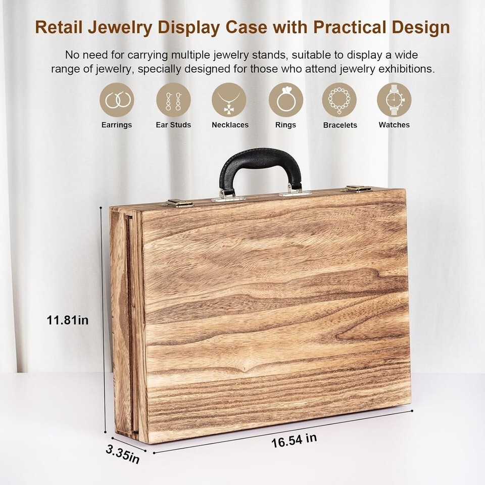HIGH-QUALITY MATERIALS: Made of solid wood, the jewelry display for vendors exudes a rustic charm. The combination of leather handle and metal lock adds a touch of sophistication, enhancing the overall appeal of your jewelry display.