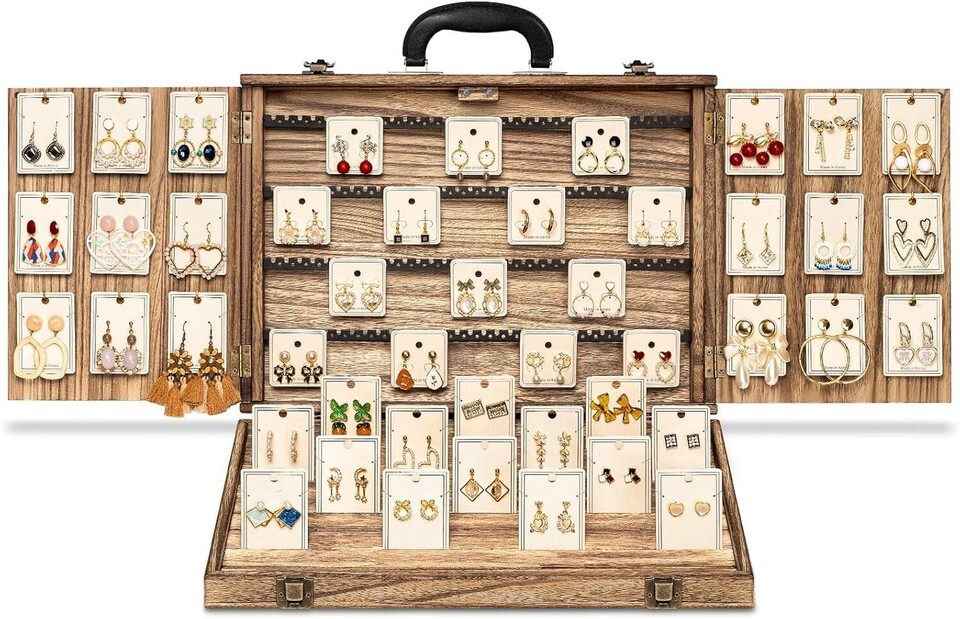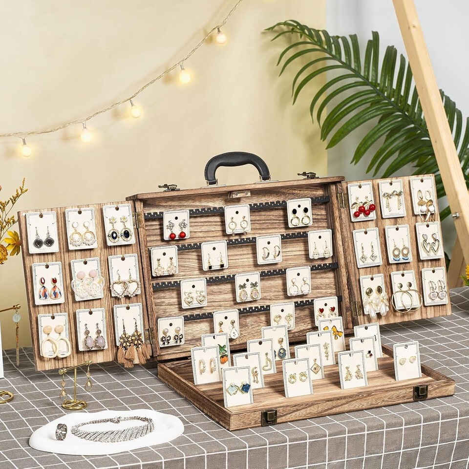 Wooden Jewelry Display for Selling Earring Card Display Holder Organizer with Lock Are you struggling with the inconvenience of carrying multiple earring holders? Are you thinking about how to add appeal to your jewelry booth to drive sales? Are you spending a lot of time picking out jewelry displays that are large in capacity and elegant in design?