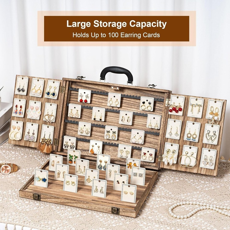 PORTABLE : No need for multiple earring display stands. The wooden earring jewelry display case allows you to showcase over 100 earring cards, as well as bracelets and necklaces. Overall size: "W x "D x "H