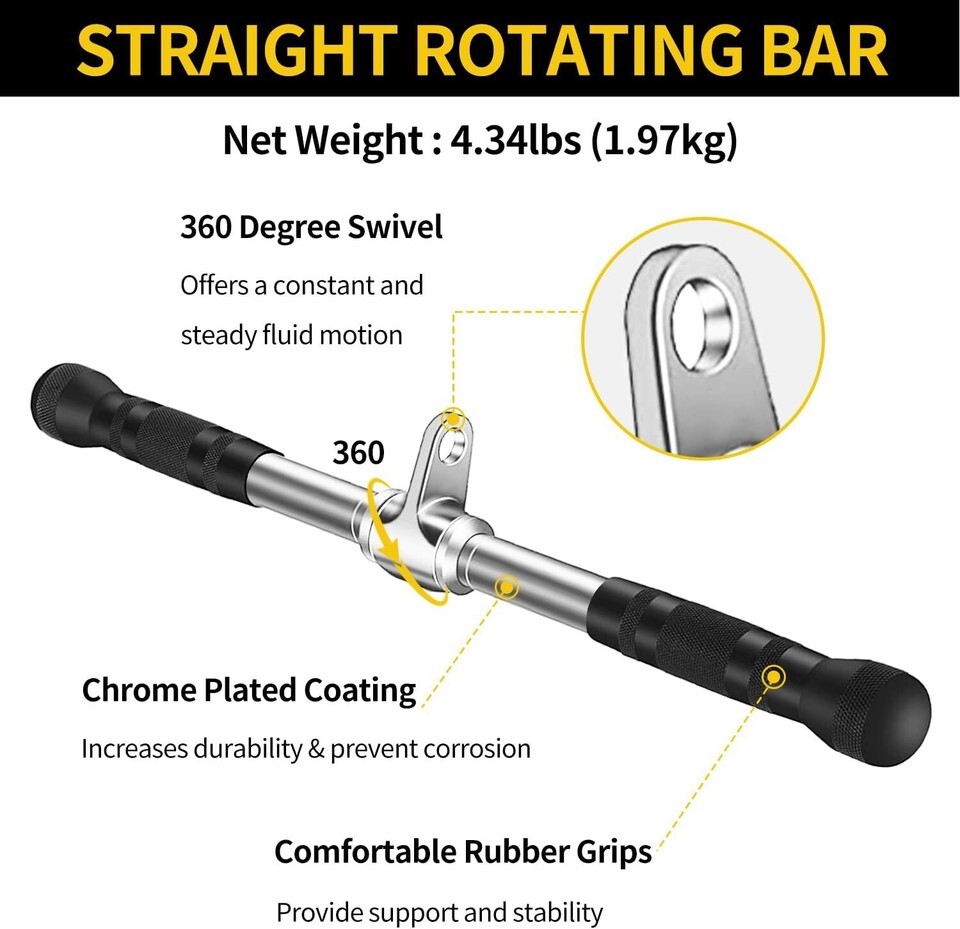 ?ROTATING STEEL STRAIGHT BAR? - Great strength steel with rubber handles prevents corrosion, slipping and endure weight up to 880 lbs ( 18-inch length and 360-degree swivel designed to provide constant and steady fluid motion during workout, fit well in your palm.