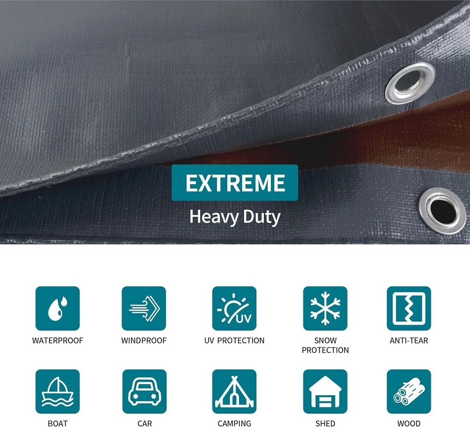 ?Super Heavy Duty Tarp? Heavy Duty Tarps are of super high quality. Our waterproof Tarps adopts higher quality, more durable advanced PE material, and reasonable proportion of components, so that more durable, more wear resistance. At the same time, we thickened each layer of the tarp to a thickness of 20mil.