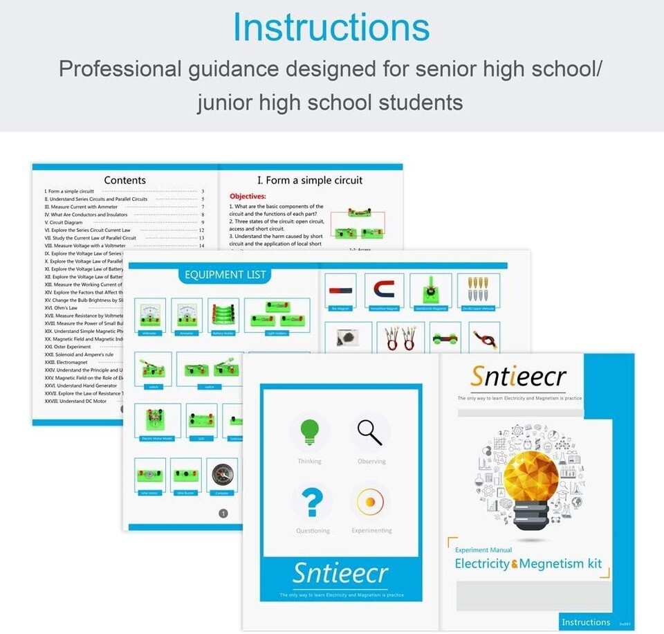 ELECTRIC CIRCUIT LEARNING KIT: Comes with 77 items for Experiment, 21 items for Magnetism, also provide a instructions for students easy to learn and use, all the accessories are packaged in a storage bag, it is good for you to find the items or bring it outside to play with your friends and classmates