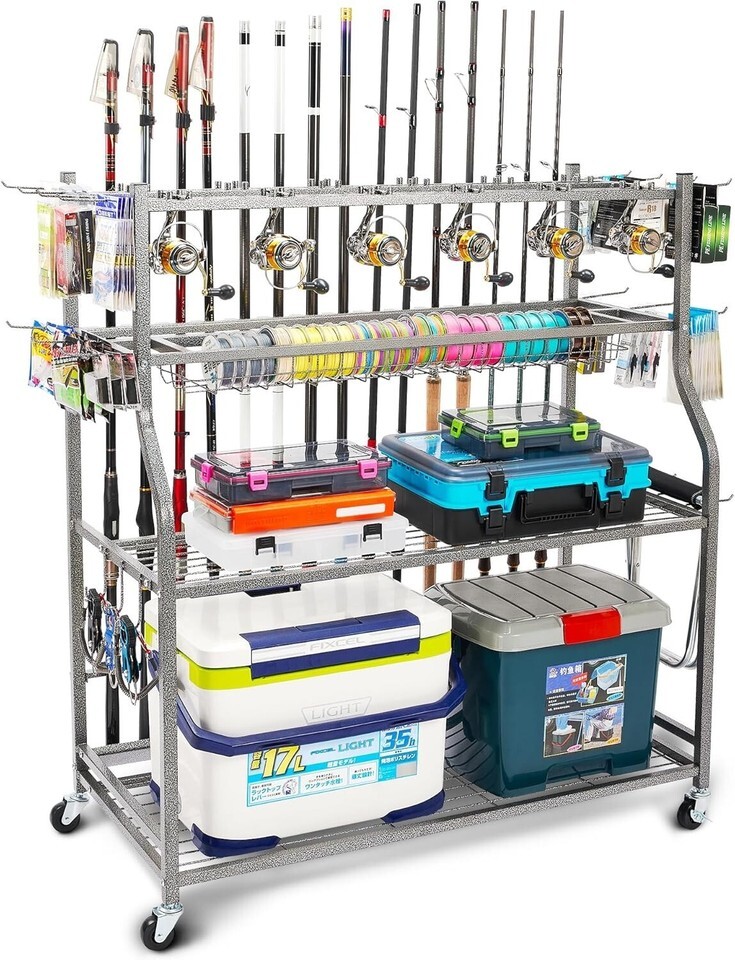 ?360 Movable Design Easy Accessible?The fishing organizer is equipped with 4 strong-bearing industrial casters, 2 of which are lockable. High quality wheel material make the whole 360 rotation rolling so smooth while providing excellent floor protection. The movable design brings a better fishing pole storage experience and also makes fishing equipment more accessible.