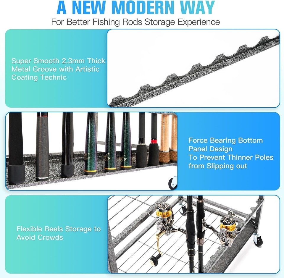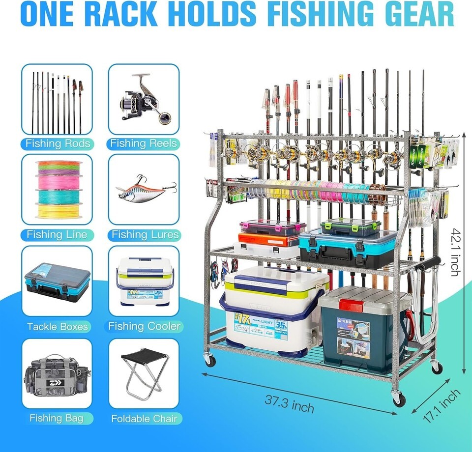 ?Large Capacity with Special Fishing Reel Storage Design?Our fishing pole holders for ground is the only one on the market that is compatible with fishing reel storage. Simple and elegant design makes it so easy to storage and display fishing reels while providing best protection for them. The dimensions of the fishing rod racks for garage is 45"(L) x ?(W) x ?(H). Thus the pole holder can hold 15 fishing rods, 12 fishing reels, 20 fishing lines, so many tackle boxes and fishing lures, also big fishing cooler and bag. It's a real cool fishing storage solution for all Anglers! One rack satisfies both fishing rod storage and fishing tackle storage.