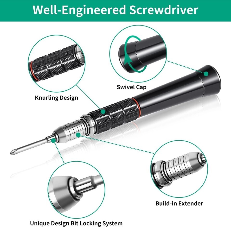 ?ALUMINUM HANDLE WITH BUILD-IN AUTO EXTENSION ROD?: patent small screwdriver handle design with build-in extension shaft which can pop up automatically,cool made from full aluminum which is durable and good feeling in your hand,silent bearing inside makesure the 360 rotatable cap,anti-slip area provide better control in your hand;