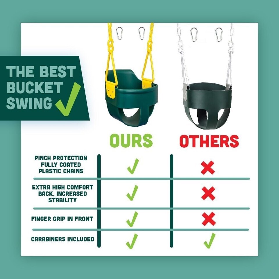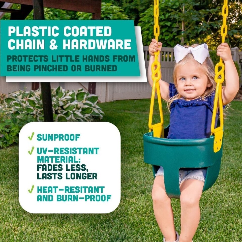 HIGH BACK SWING: A fun addition to any playset or jungle gym this full bucket toddler swing has a patent pending design featuring a front rolled finger grip, curved back, and pinch-free plastic coated chains.