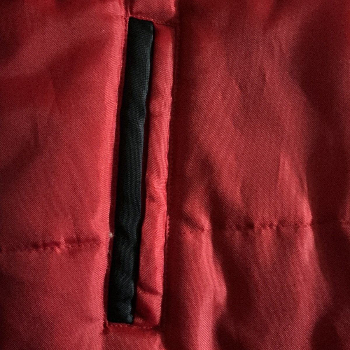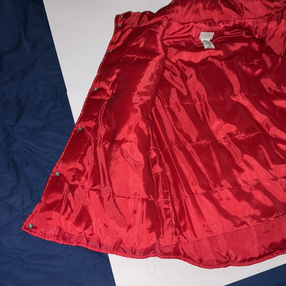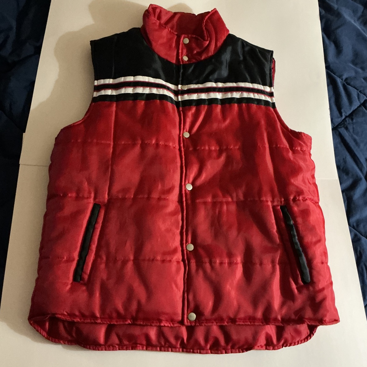 Stylish red vest with black blue accents. Features snap buttons and white stripe detail. Ideal for layering.
