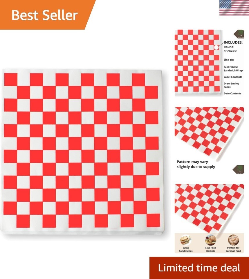 Bulk package of 1,000 sheets of red and white checkered deli paper is ideal for lining food baskets, wrapping food at carnivals, or wrapping burgers. INCLUDES 200 small, white, round stickers to use with labeling, sealing, or dating food. Food grade paper is festive and bright. Bright red compliments color of food and helps people enjoy thier goodies before ever taking a bite. JAK exclusive product. PLEASE NOTE: Due to supply chain issues, the size of the red and white check may vary.