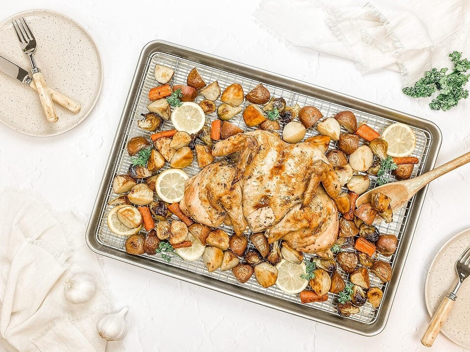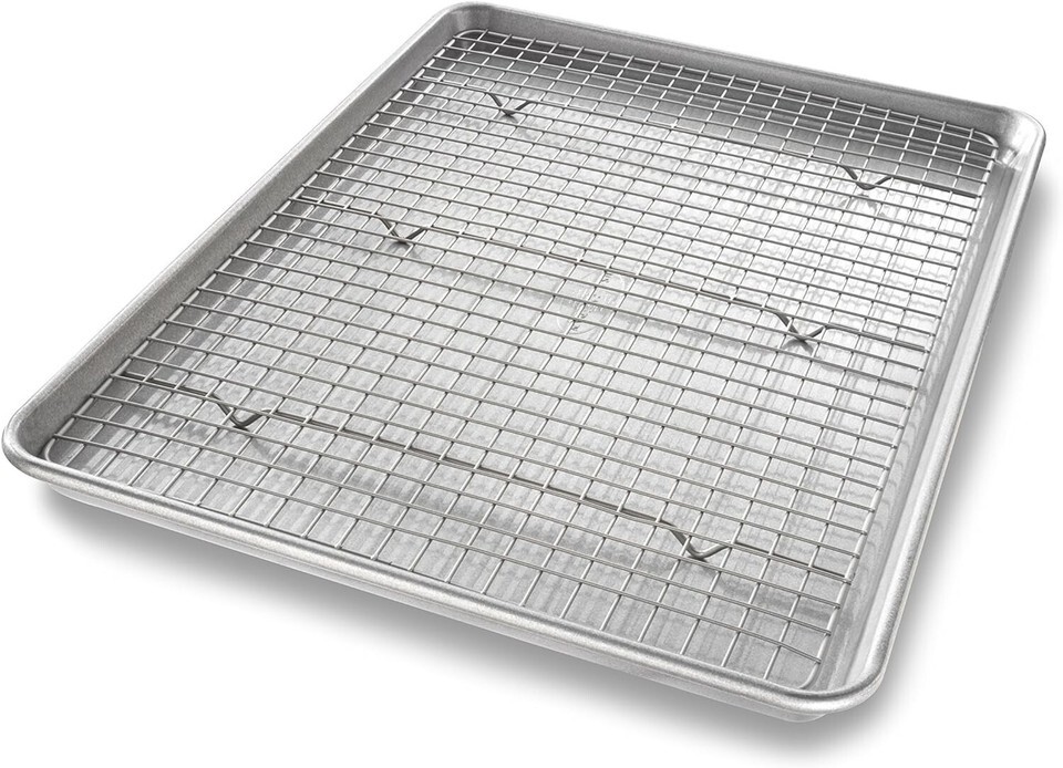 Classic half sheet pan and cooling rack for baking cookies and cakes or roasting vegetables; both are oven safe up to 450 degrees Fahrenheit
