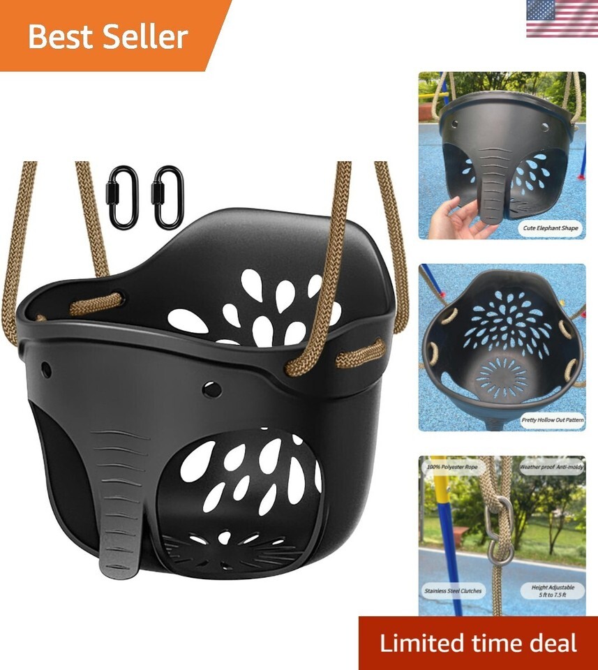 Heavy-Duty High Back Full Bucket Toddler Swing Seat with Locking Carabiners and Adjustable Rope, Cute Elephant Shape Design, 600LB Weight Limit Bucket Swing, Black