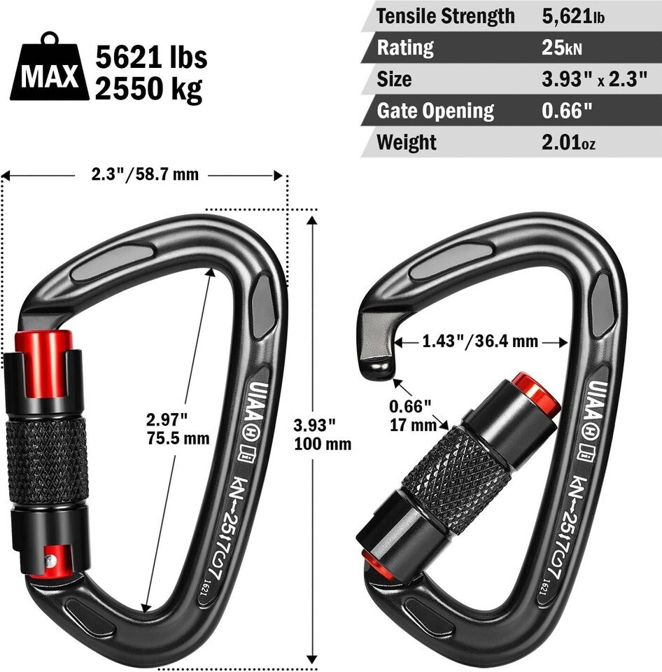 ?STRONG CARABINER?-UIAA certified, Major axis strength 25kN (5,621lbs), Cross-loaded at 7kN, Hot forged construction rated for tree climbing, hiking, rappelling, rescue, locking big adult dogs, hammock, swing etc