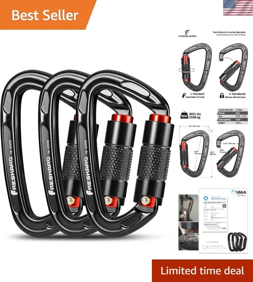 UIAA Certified 25KN Auto Locking Climbing Carabiner Clips, Twist Lock, and Heavy Duty Carabiners for Rock Climbing, Rappelling, and Mountaineering, D Shaped Inch, Large Size, Black