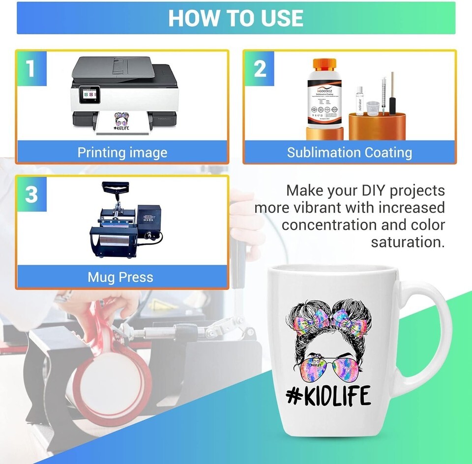 PACKAGE INCLUDES: sublimation coating for mugs includes 250 ml bottle of universal coating, 10ml bottle of activator, 1 x measuring cup, 1 x foam brush, 1 x syringe and stirring stick. The product comes with instructions. The coating is easy to apply, just mix the contents of the bottle together and apply with an airbrush or paintbrush. The universal coating will make your mug fade-resistant, dishwasher safe and microwave safe.