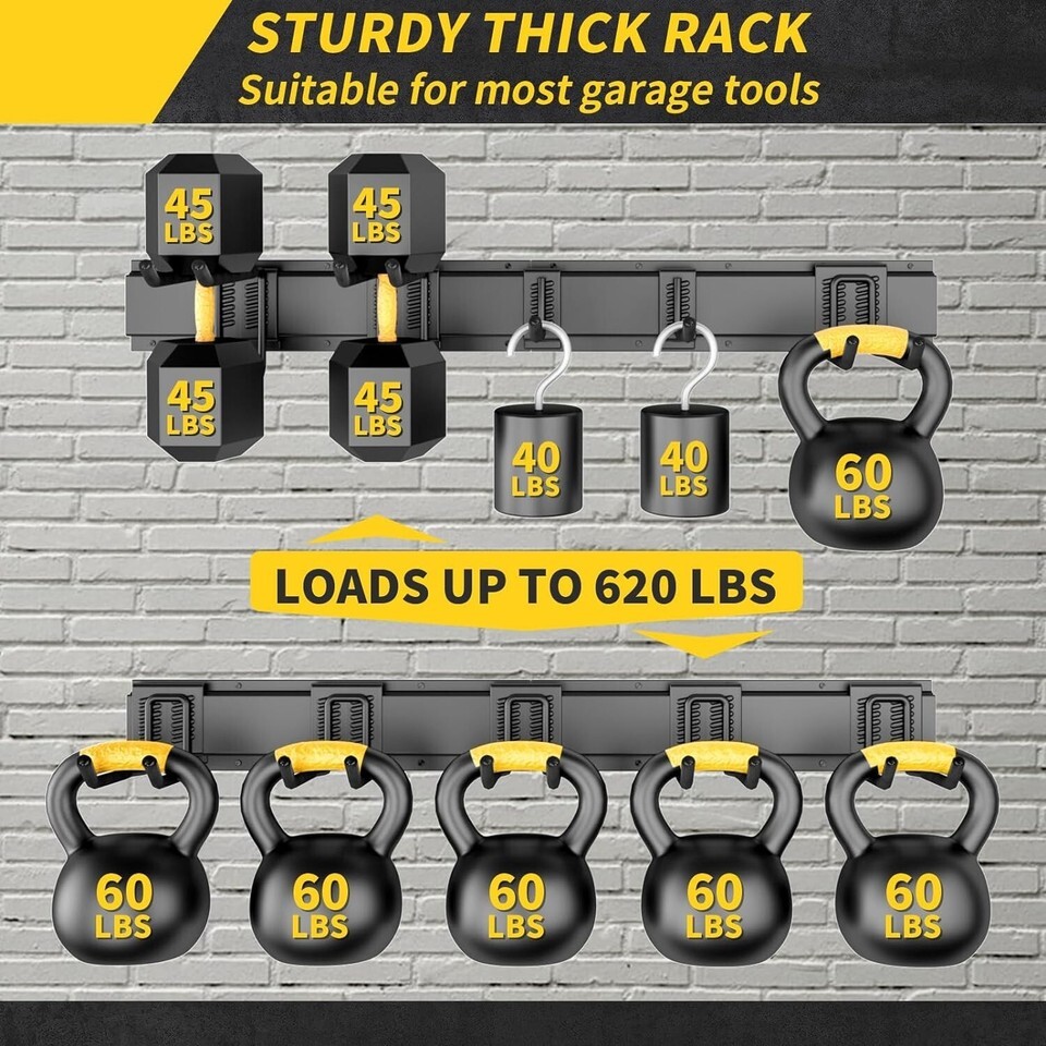 Heavy Duty Sturdy: Crafted from premium quality, heavy-duty alloy steel materials, holds up to 620LBS. And garage storage is double powder-coated to protect it from rusting improve its durability, resist chipping and cracking. The hanging arm of the hooks is covered with rubber to prevent tools/shovels from slipping. The rugged construction ensures it can handle frequent use and endure the weight of your tools, long-lasting and sturdy.