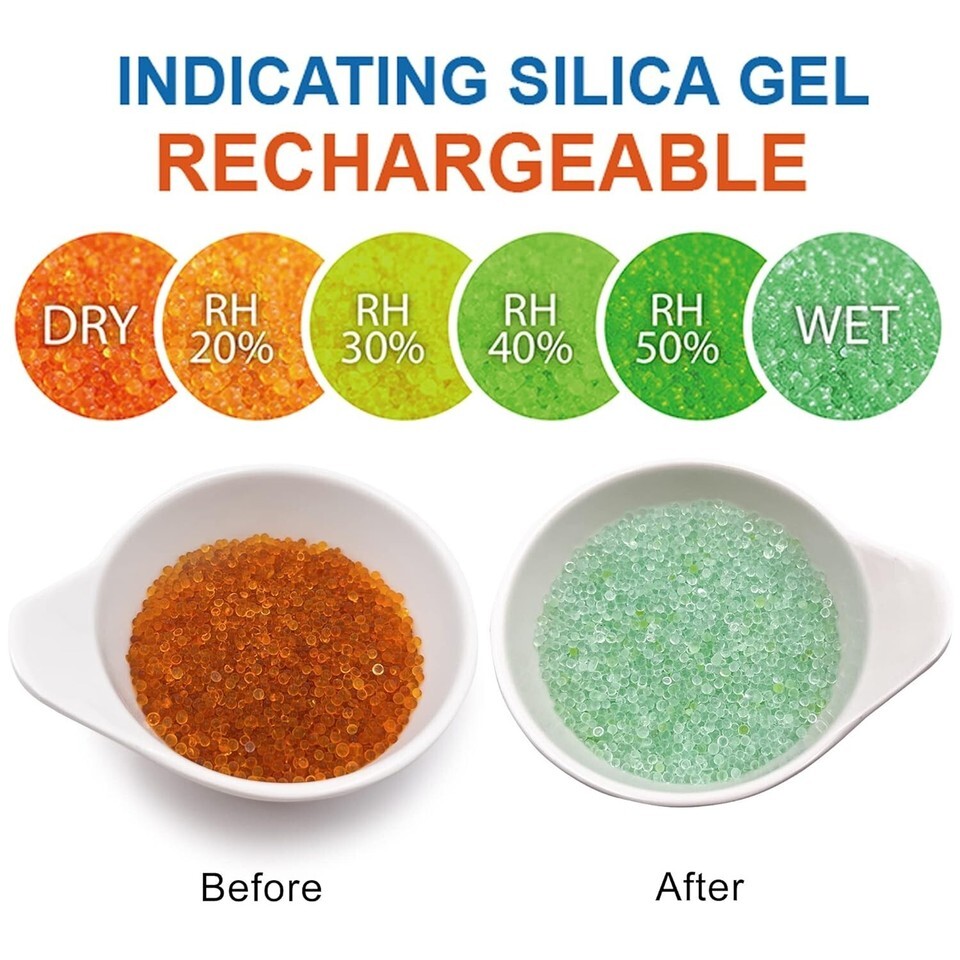 ?Indicating Silica Gel Beads?: cobalt chloride-free orange indicating beads (2-4mm in size) are designed to change color within a humidity range of 20%-50%. Once saturated with moisture, the beads will complete the color change to LIGHT green. It's important to note that the initial color change does not indicate full saturation. The beads will continue to absorb moisture until reaching 50%RH. We recommend periodically checking the silica gel beads to ensure their effectiveness.