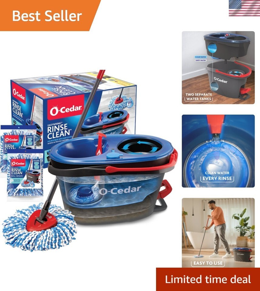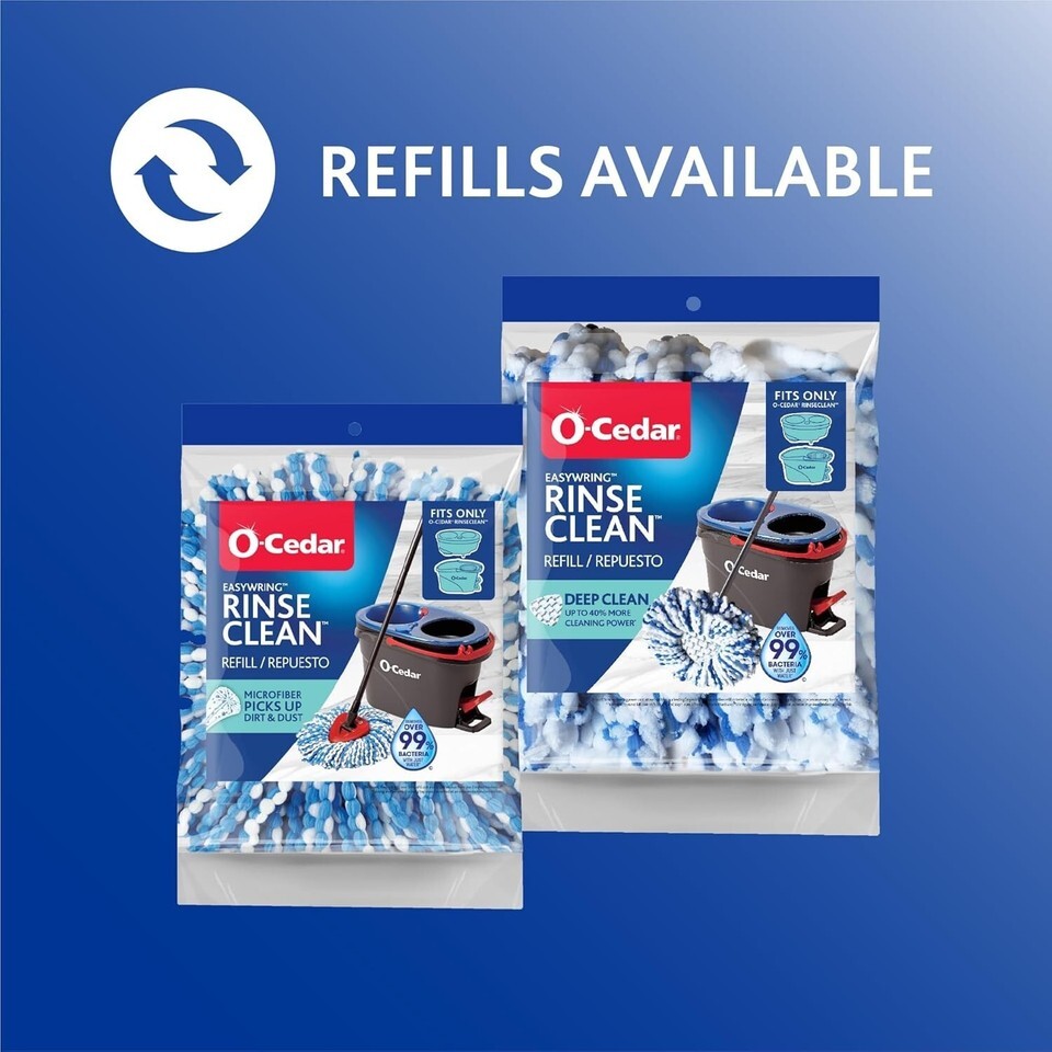 Cleaning just got cleaner with the EasyWring RinseClean Spin Mop system. Its patented dual-chamber bucket technology features separated clean and dirty water tanks, making it easy to continuously clean with clean water. So, you never have to mop with dirty water again. What?s more, the microfiber mop head removes dirt and grime without water. Of course, you can use your favorite cleaner?you just don?t need to anymore. * BMA Labor GbR Labs tested RinseClean refills on December 21, 2020. This mop includes 2 extra microfiber mop head refills.