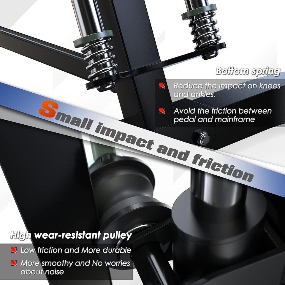 ?Durable Construction?This Folding Climbing Machine's frame is made of frosted steel, which can be protected against corrosion. The large pedals, suction cups, and triangular structure make the climber more stable and durable. The steel spring avoids friction, protect the knees and ankles. Max User Weight is 300lbs.