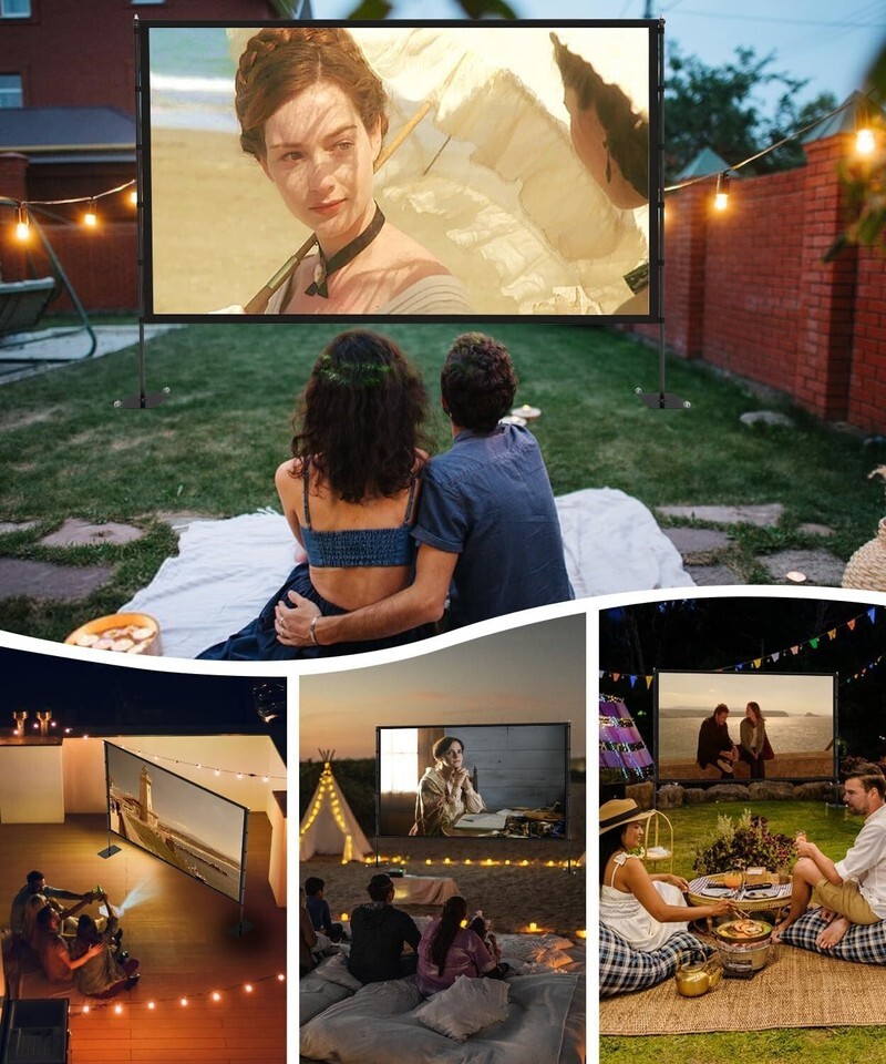 WRINKLE-FREE PROJECTOR SCREEN:The 120 inch projector screen is made from a foldable,washable premium milk silk material that ensures a wrinkle-free stays clean and provides high-resolution images,supporting both front and rear a 16:9 aspect ratio and a 160 wide viewing angle,you can enjoy an amazing movie night!