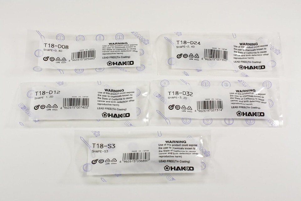 Features: Fine Tip,Hakko T18 Series,Chisel Pack,T18-D08,T18-D12,T18-D24,T18-D32,T18-S3,Pack of 5 different tips,0.8 x 14.5mm,1.2 x 14.5mm,2.4 x 14.5mm,3.2 x 14.5mm,5.2 x 18mm,Copper material,Flat blade edge,No batteries included,No batteries required,UPC: 818497013058