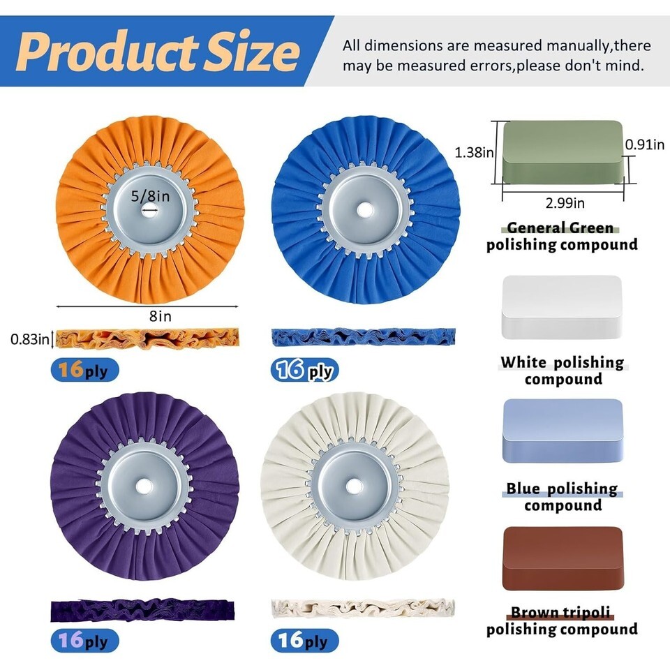 8-inch diameter buffing wheels with 5/8 inch center hole, 16 layers for better effect