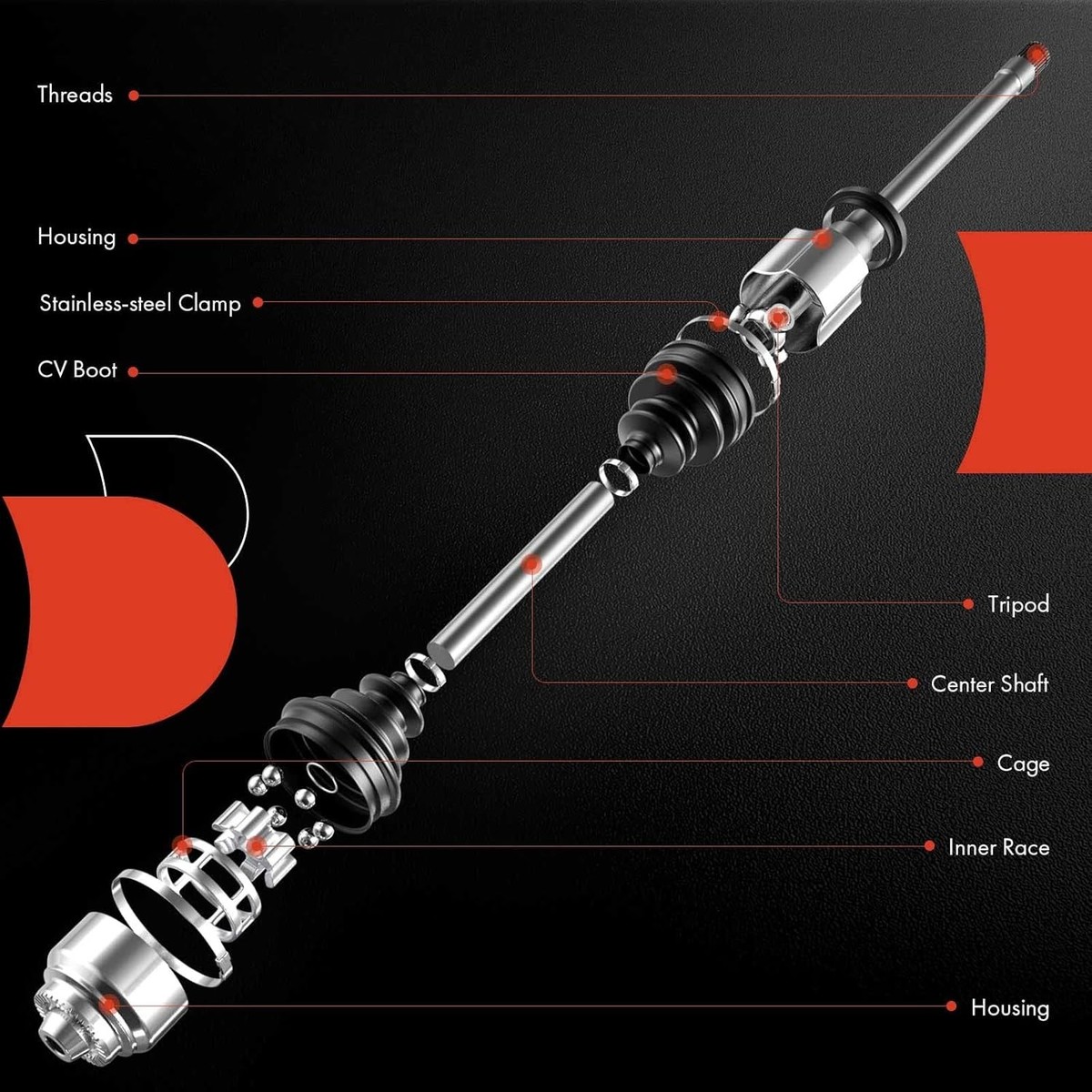 [Function]: CV axles serve as the final link between the engine and the wheels, transferring power from the vehicle's transmission and differential to the wheels to drive the vehicle forward.