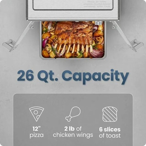 SPACIOUS 26-QUART CAPACITY: Fit more than enough food for the whole family in this stainless steel air fryer. The extra-large interior can accommodate up to a 12-inch frozen pizza, a whole four-pound chicken, or six slices of toast.