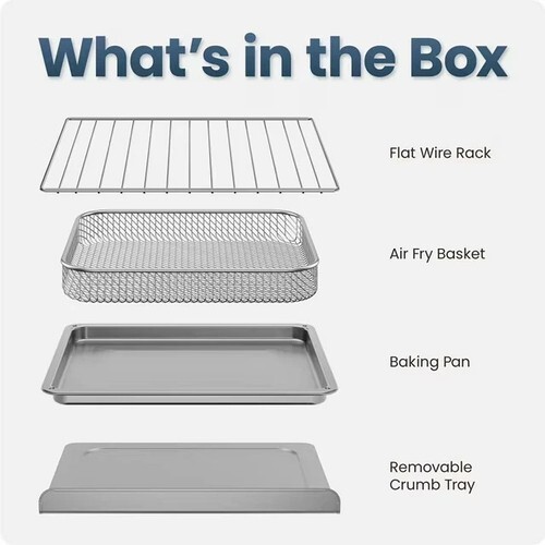 INCLUDED ACCESSORIES: This toaster oven air fryer comes with everything you could possibly need, including an air fryer basket, a baking/roasting pan, a flat rack, and a crumb tray to catch any mess. The basket and rack are also dishwasher safe.