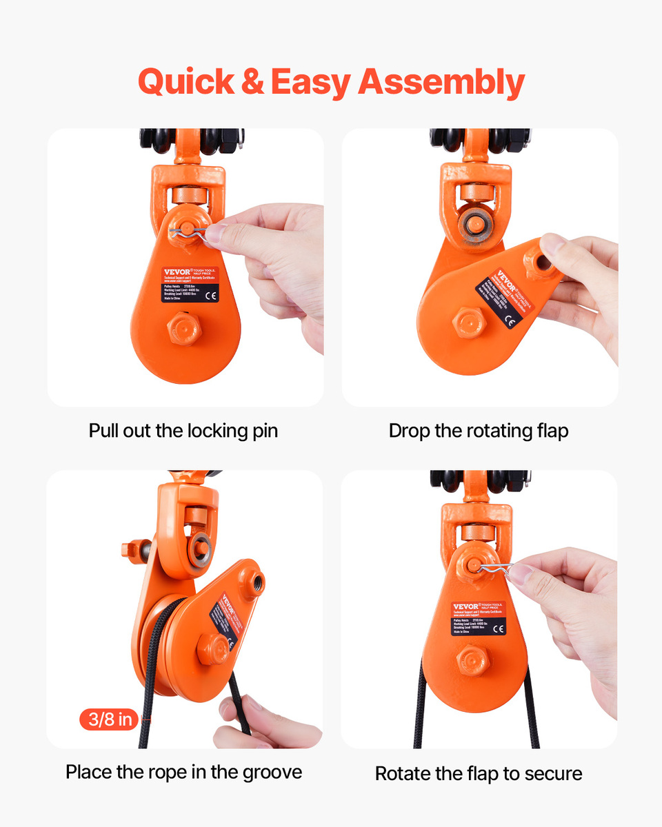 Easy to Use: Open the side panel of the pulley block and simply thread the lifting rope throughโno more struggling to get the rope in place. It works with 3/8-inch cables, and you can easily inspect or swap out the rope as needed. One-person operation made easy!