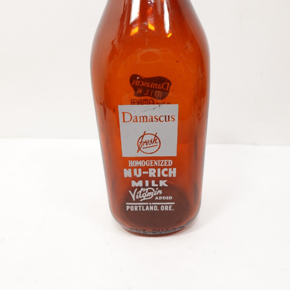 Vintage Damascus Milk Co. 1-quart amber glass bottle from Portland, Oregon. Features white and red ACL (Applied Color Label) graphics with ?Damascus Fresh Homogenized Nu-Rich Milk ? Vitamin Added? on the front and ?In This Amber Glass Bottle Is Your Guarantee of Protected Flavor? on the reverse. Marked ?Duraglas? on the base.