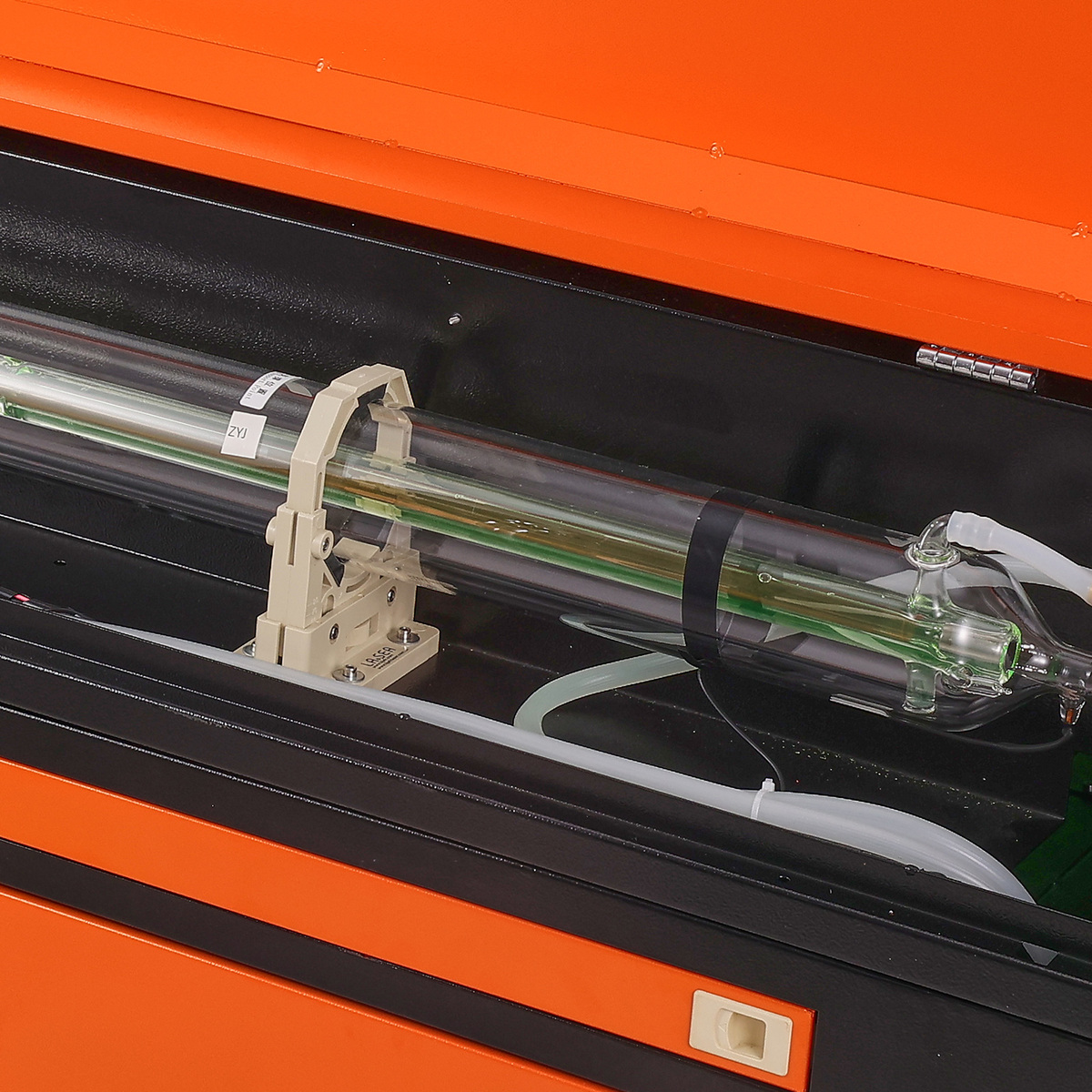 Secure Easy Operation: Work with peace of mind! The transparent window is tinted for eye protection, allowing you to monitor engraving progress at any time. The power automatically cuts off when opened. An emergency stop is standing by should anything go sideways. Our CO? laser machine also has an air assist to blow away all smoke, dust, and sparks. Movable wheels keep everything rolling smoothly.