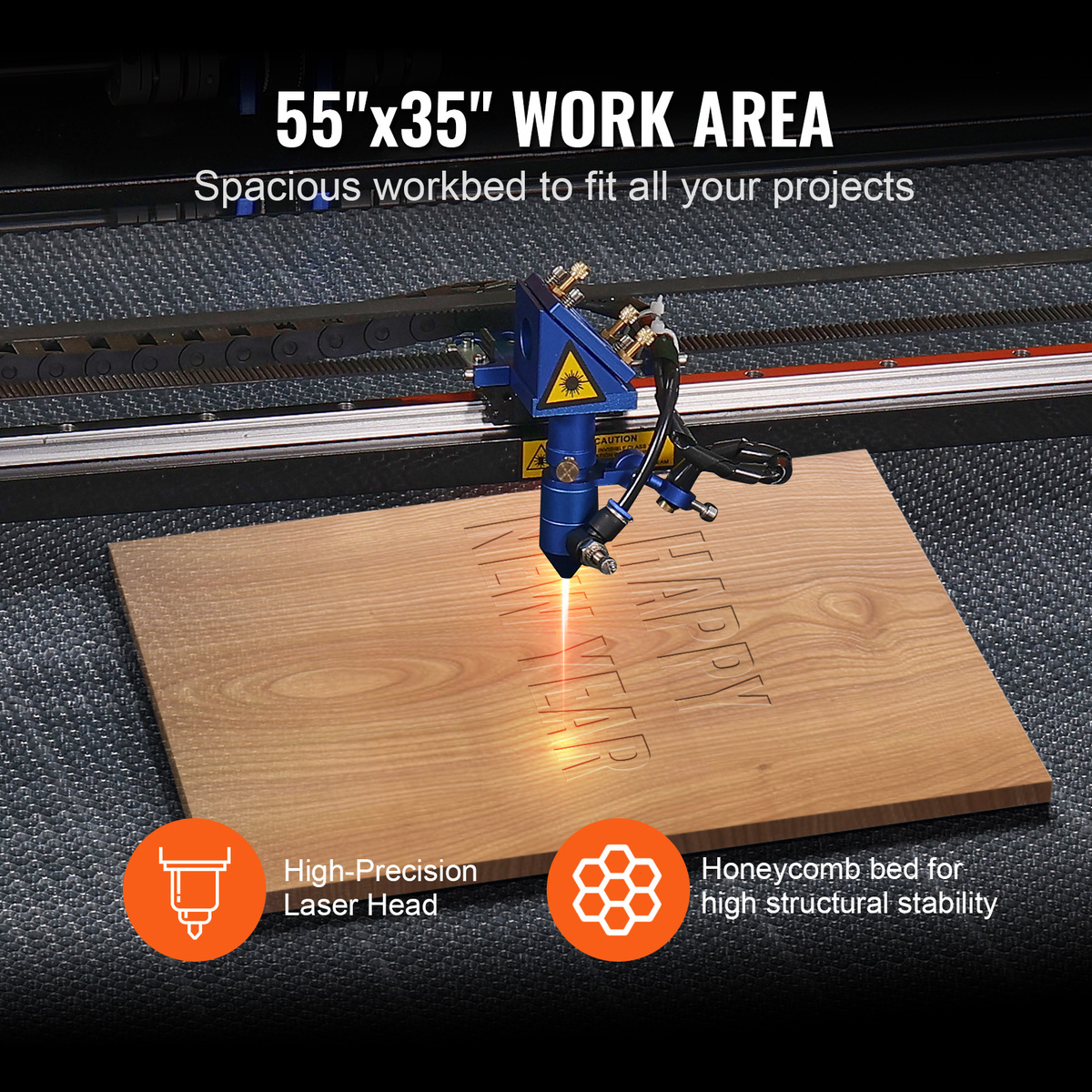 35 x 55 in Working Area: Is space a concern for you? Well, get ready to work comfortably! This CO? laser engraver features a spacious 35 x 55 in/900 x 1400 mm working area, providing a generous 1925 in of workspace to fit all your projects. The bed is designed with a honeycomb structure to ensure high structural stability. Its front and back pass-through doors open up even greater possibilities.