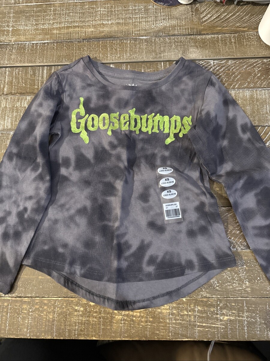 This is a size XS girls' Halloween shirt featuring the brand Goosebumps. The shirt is a long sleeve top in a multicolor Halloween-themed design, perfect for the spooky season. Made for young girls, this shirt combines fun and style, making it a must-have addition to any Halloween wardrobe.