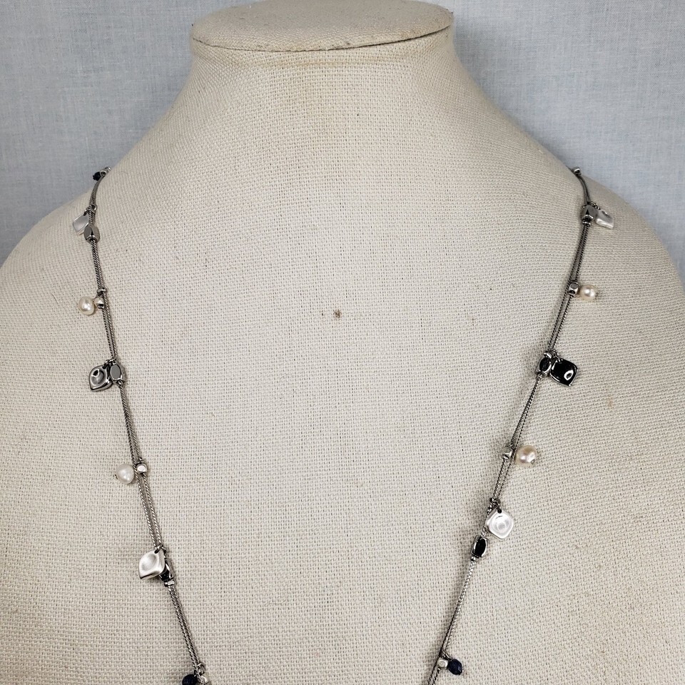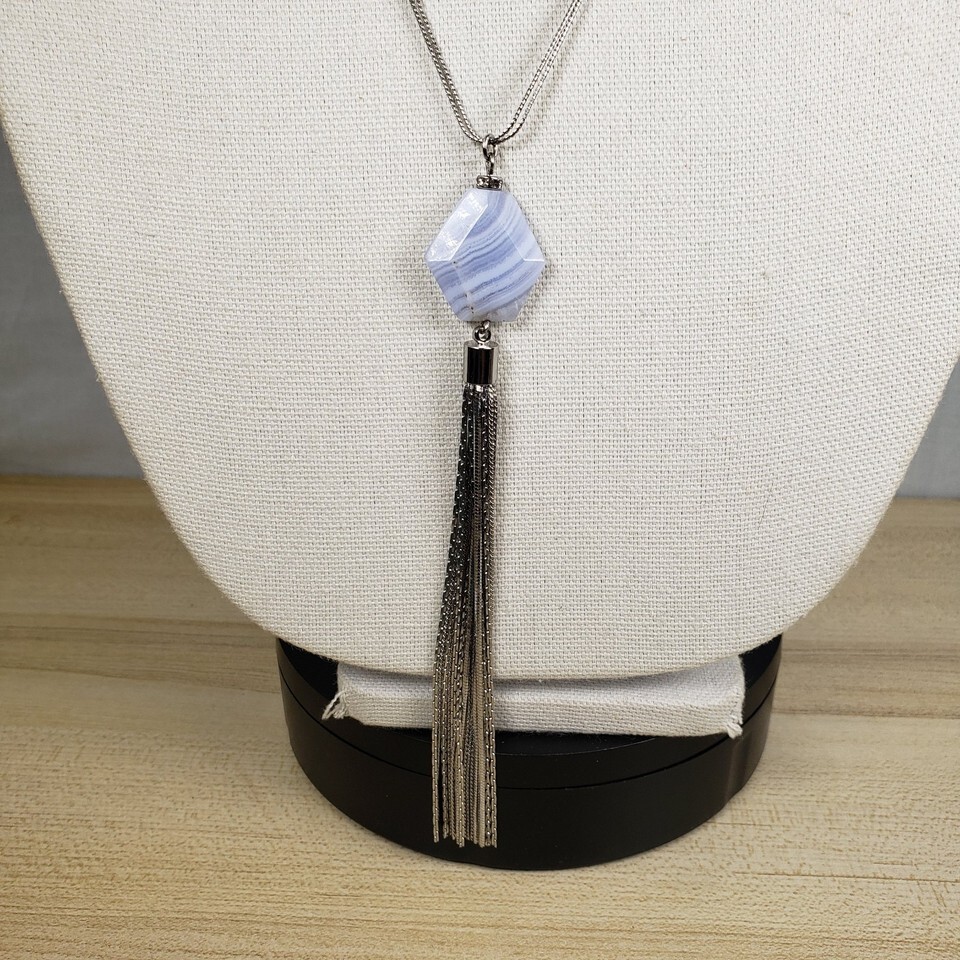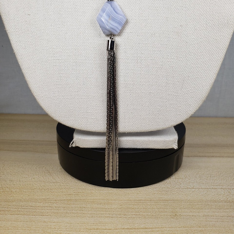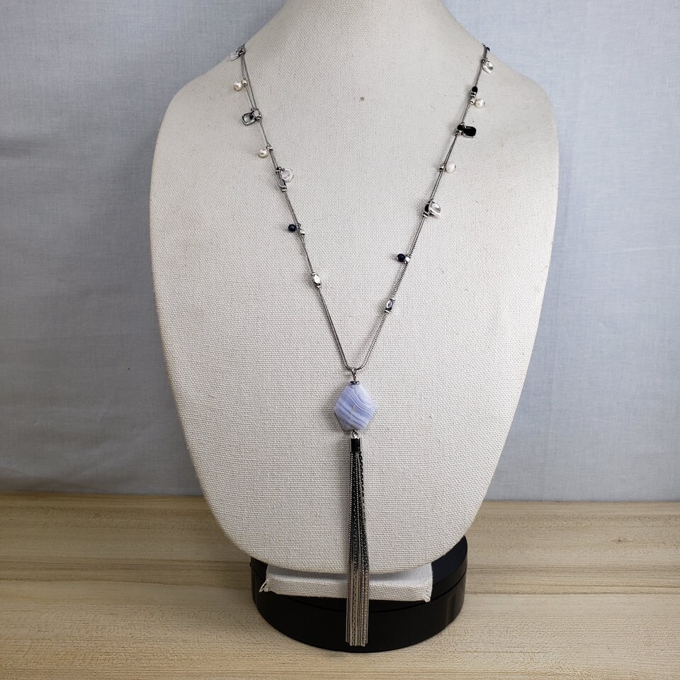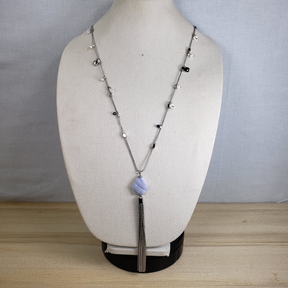 Vtg WHBM Freshwater Squash Pearl Blue Marble Agate Y Style Tassel 32" Necklace