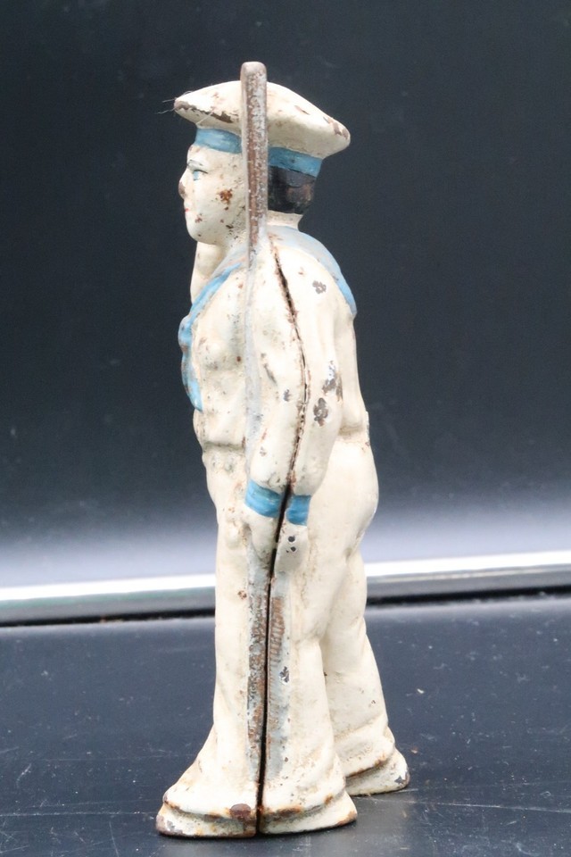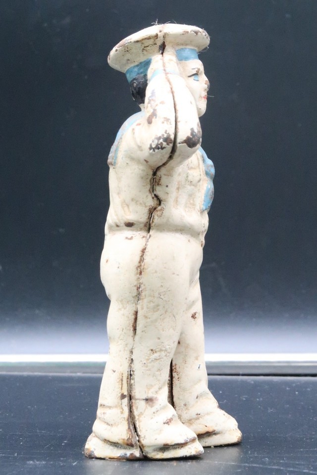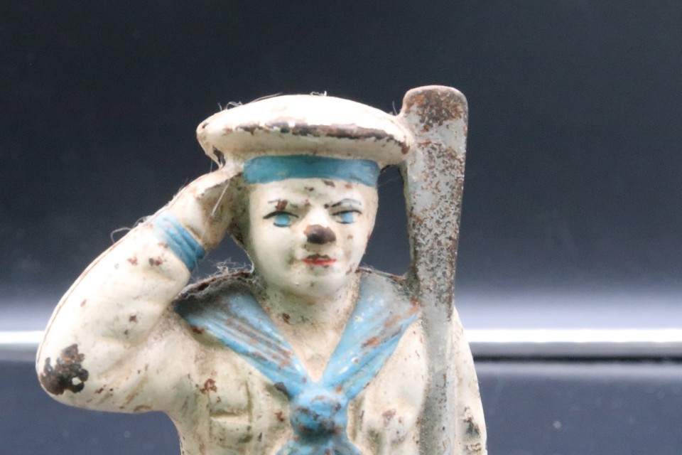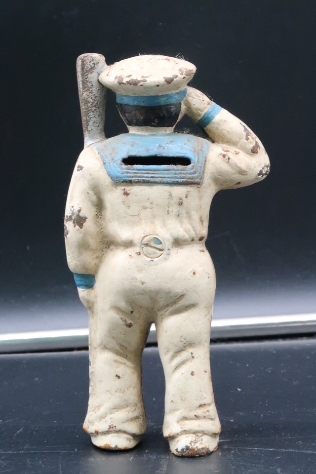 Vintage Antique Military Navy Sailor Saluting Oarsman Cast Iron Coin Bank 5.5"