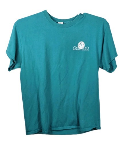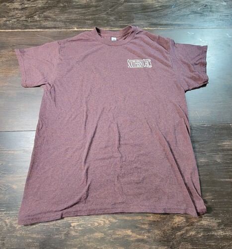 Gildan, it says heavy cotton but doesn't feel heavy to me. 50% Cotton 50% Polyester. Made in Honduras, machine wash and dry. Gray with imprint on back Trust in the Lord with all your HEART with some scroll like accents and Southern Chics logo on front.