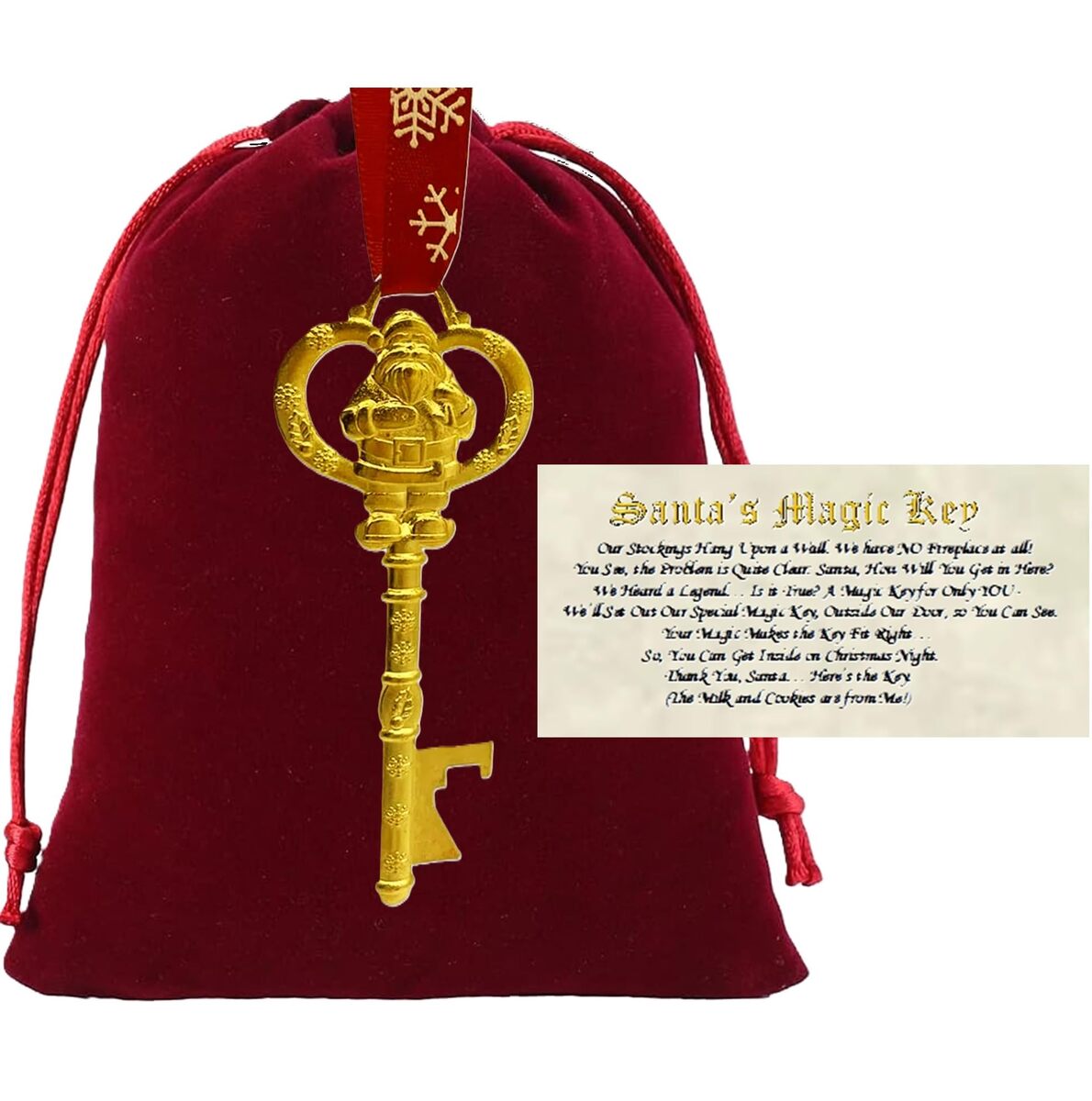 Product description: No Fireplace or Chimney? Bright Shiny Golden SANTA?s MAGIC KEY / BOTTLE OPENER Hanging Christmas Ornament for Houses without Fireplace or Chimney - Includes RED VELVET GIFT BAG and 2 Different LEGEND TRADITION VERSE CARDS to Choose from for Display