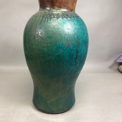 Handmade Turquoise Teal Large Vase - 17.5?H. There is some paint missing on the sides. Has a unique design. Turquoise and green colors mostly. This vase weighs 8 pounds as is. Im not sure what material this is made from. We allow local pickups as well.