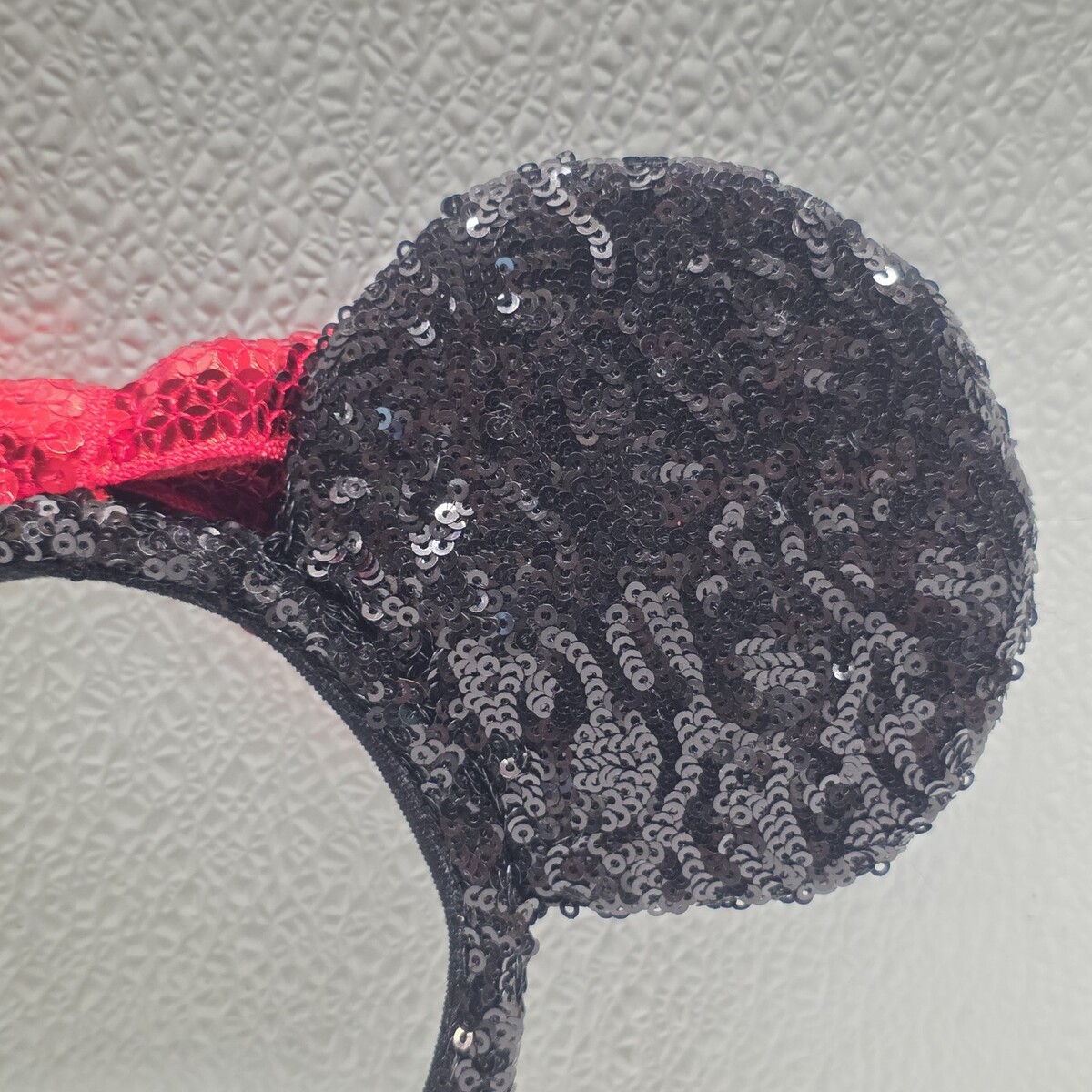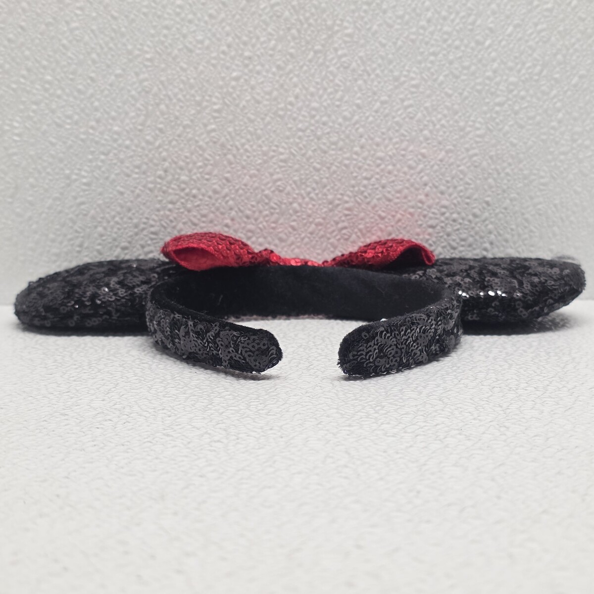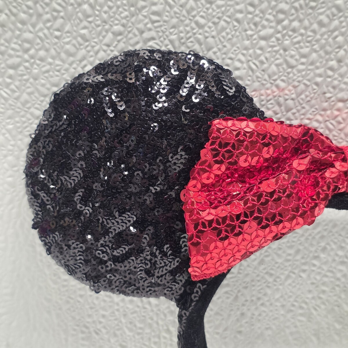 DISNEY PARKS Minnie Mouse Black Sequin Red Sequin Bow Ear Headband. Images show actual item that will ship.