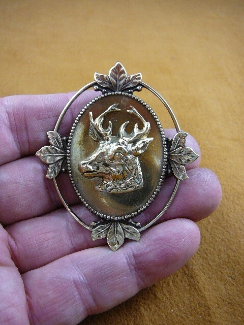 (Internal #B-DEER-4) This is a brass - - stamped buck deer head on a piece of oval brass with leaf accent design, made into a pin/pendant with beautiful detail. This gorgeous - - stamped brass is antiqued, then buffed to create some shine. The pin/pendant (glued on the back) combination on the back of the piece of brass makes it easy to wear as a pin or pendant.