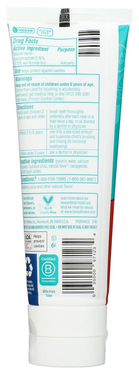 Expiration Date of 5/2027 ? WHAT YOU'LL GET: One 5.1-ounce tube of Tom's of Maine Kid's fluoride toothpaste in the Original Silly Strawberry Flavor ? ADA APPROVED: Contains fluoride for anticavity protection, and calcium and silica to gently clean teeth ? TASTE THEY LOVE: You asked. We listened. Tom?s Natural Kid's Toothpaste back in original formula! This natural kids toothpaste comes in a fun, fruity flavor to help develop brushing habits ? RECYCLABLE TUBE: Once empty, replace cap and recycle with #2 plastics ? NATURAL RESPONSIBLE: Contains no artificial preservatives, colors or flavors and is not tested on animals